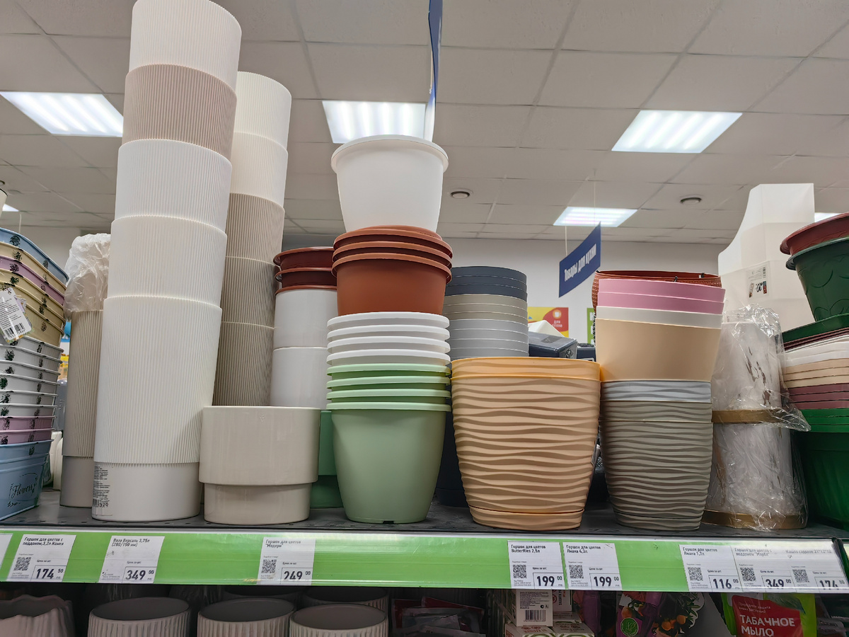 Наверное, это один из любимых магазинов у многих и для многого. Тут и всякие хозяйственные мелочи, рукоделие, канцелярия, посуда, заметный огородный отдел и вместе с ним и всякие симпатичные штуки для комнатных растений. На днях как раз посещала один из Фикс-прайсов. Конечно же, ушла с покупками))) Прежде всего, тут куча горшков и разных ваз, которые можно приспособить для фитильного полива. Тут и пластик и керамика разных размеров. Всегда можно подобрать интересненькое или техническое. Вот не смогла пройти мимо этих керамических горшочков голубых и мятных)) Их там две формы было, купила обе. Очень миленькие глиняные горшочки с белым рисунком, но у всех к сожалению были трещины на донышке. А так прямо красотища. С вензелем голубой был горшочек в единственном экземпляре. Все они с дренажными отверстиями. И в кадр попал пластиковый набор из трех плоских горшков с поддоном для суккулентов. Видела такой на маркетплейсе существенно дороже. Вот парочка голубых. В один я поставила Биркин, а в