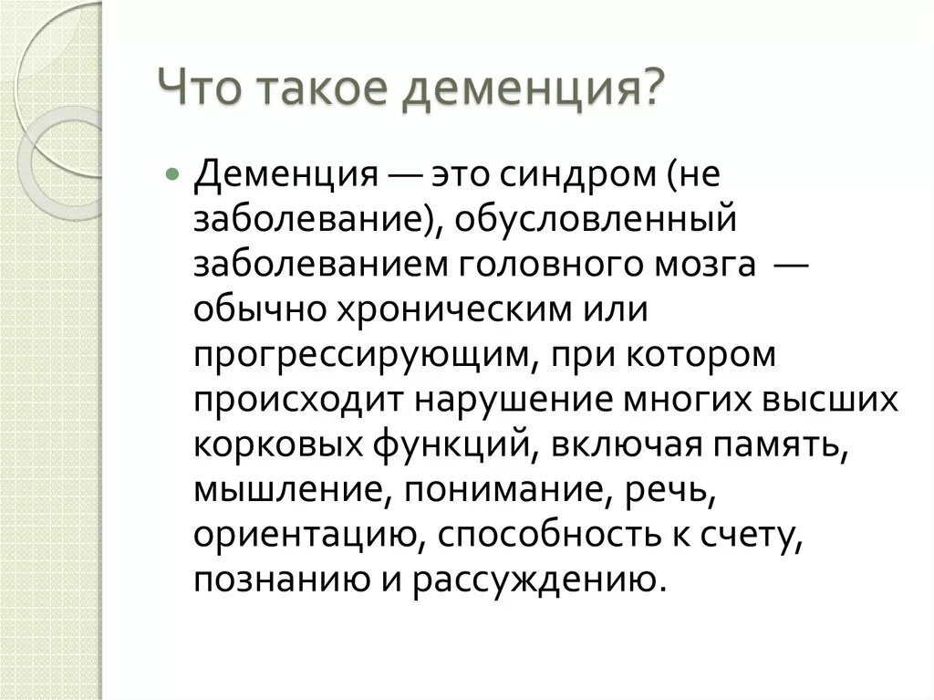 Деменция – это приобретённое слабоумие, стойкое снижение познавательной деятельности с утратой ранее усвоенных знаний и практических навыков и затруднением, невозможностью приобретения новых.