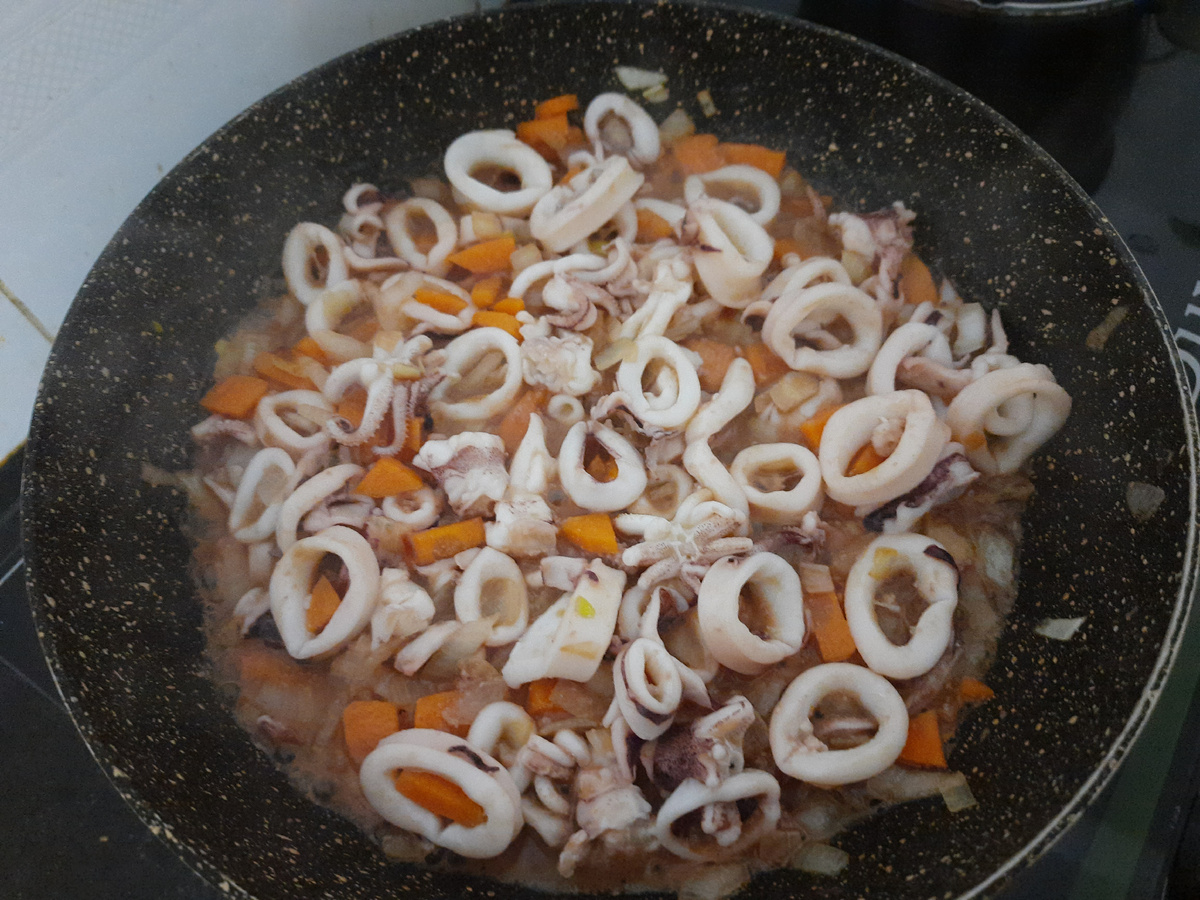 Сначала делала обжарку из моркови и лука. Один раз туда добавила еще кабачок. Кальмаров почистила, помыла, нарезала кольцами. Затем добавила к почти готовой зажарке. Полила соевым соусом и потомила под крышкой пару минут.