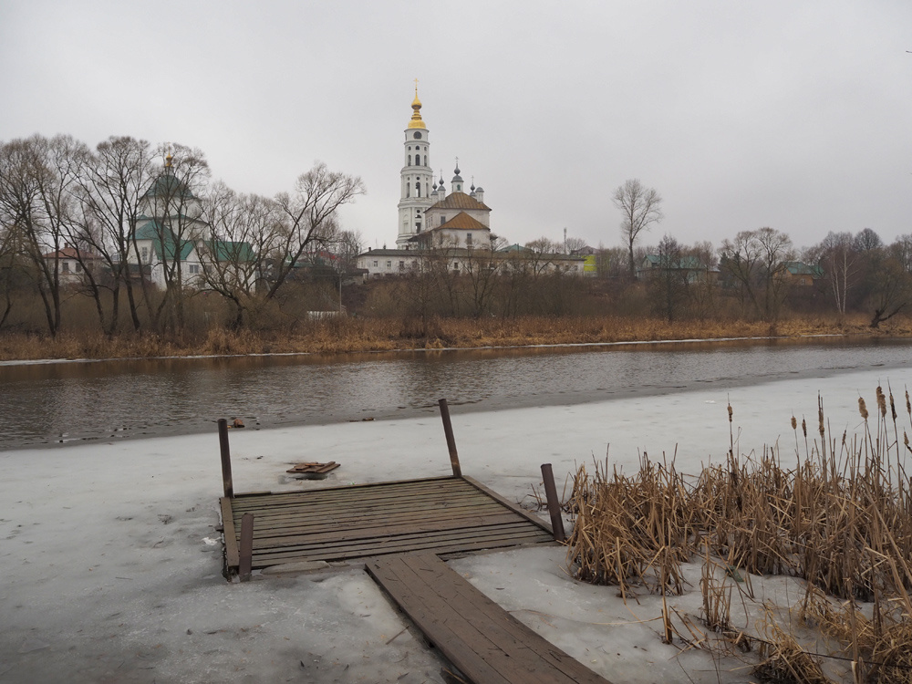 Напомню, что 20 февраля в плане подготовки своей фотовыставки я ездил в п. Савино, чтобы предоставить фотоэкспозицию Савинскому краеведческому музею. Об этой поездке на канале был рассказ. Прошло три недели, и открытие фотовыставки состоялось. Это произошло 13 марта. На открытие ехал тем же маршрутом. Интересно было сравнить, как изменилось состояние природы по прошествии трех недель. Как и в первую поездку, сделал остановку в Лежневе. И первый кадр – вид на храмовый комплекс со стороны Ухтохмы.