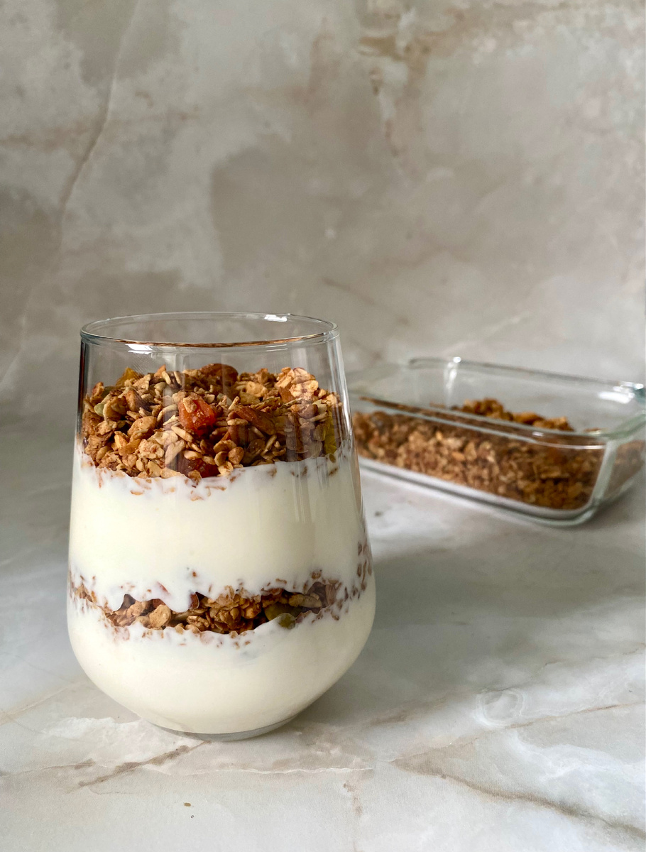 Один раз попробовав домашнюю гранолу, вы не захотите покупать ее в магазине. Во-первых, вы сами выбираете что в неё класть. Во-вторых, в ее составе только натуральные ингредиенты, без добавок и сахара. Ингредиенты: 300 гр овсяных хлопьев 100 гр разных орехов (у меня макадамия, кешью, миндаль) 2 ст.л тыквенных семечек 1 ст.л семян льна 70 гр сухофруктов (курага, чернослив) 60 гр сливочного масла 3 ст.л кленового сиропа или мёда Щепотка соли 1 ч.л корицы Приготовление: Измельчите орехи и семена в блендере до среднего размера импульсами (не в порошок). Промойте, просушите и нарежьте курагу с черносливом на небольшие кусочки. В большой миске смешайте овсяные хлопья, измельчённые орехи, семена, щепотку соли и корицу. В микроволновке растопите сливочное масло, добавьте кленовый сироп или мёд. Хорошо перемешайте до однородности. Вылейте получившуюся массу в миску с сухими ингредиентами. Тщательно перемешайте. Разогрейте духовку до 170°C. Выложите смесь на противень, застеленный пер