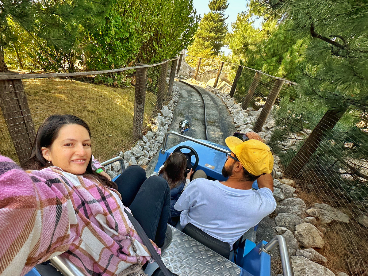 Это Джип, Алина всегда садилась за руль, я или Андрей рядом и кто-то сзади. Но на задних сидениях не удобно взрослым , особенно с длинными ногами. Кто сидел спереди рядом с дочкой нажимал на газ, потому что ребенок до педали не достает. И нам, и дочке этот аттракцион понравился, он вообще не страшный.
