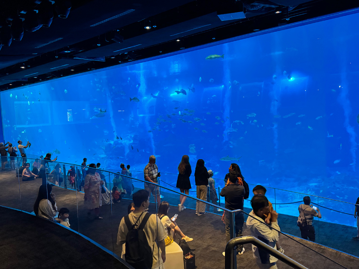 Главный аквариум (Open Ocean Habitat) Это сердце океанариума — огромный резервуар с панорамным стеклом, где можно наблюдать за акулами, скатами, гигантскими мантами и другими крупными морскими обитателями. Вид настолько захватывающий, что можно провести здесь часы, наблюдая за подводной жизнью. Зона коралловых рифов Здесь представлены яркие кораллы и их обитатели: тропические рыбки, морские звезды, ракообразные и другие красочные создания. Зона медуз Одна из самых завораживающих экспозиций. Медузы разных видов плавают в подсвеченных аквариумах, создавая ощущение, будто ты попал в другой мир. Зона акул В этой зоне можно увидеть различных акул, включая редкие виды. Мурены. Если вы обратите внимание на размер зеленой, это огромная несколько метровая мурена, приводит в какой-то ужас, такую в море встретить 🫣… Ну и на последок -скаты! На них можно смотреть вечно, как на волны и огонь. Они так красиво плывут…, завораживает. А если вы еще поймете каких они размеров☝️, почти с челов