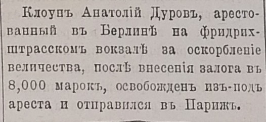 Великий клоун Анатолий Дуров оказался за решеткой по обвинению в оскорблении «его величества» — самого кайзера Вильгельма! Это случилось прямо на сцене берлинского «Винтер-гардена». Дуров приехал на гастроли без всяких политических намерений. Но артистическая натура взяла верх: момент для острого каламбура был слишком хорош, чтобы его упустить. Тем более, что задето оказалось и самолюбие. Все началось в антракте. Дуров сидел в буфете с русскими друзьями, когда к их столику бесцеремонно подсел немецкий полицейский. Снял каску, постучал ею по столу, подозвал официанта. Русские постарались разрядить неловкость, а сам Дуров даже предложил немцу бокал вина: — Не угодно ли с нами за компанию? Но тот грубо отказался, добавив: «Я не хочу, может, ваши свиньи хотят?» Первая мысль Дурова — врезать наглецу. Но он сдержался. Простая драка ничего бы не изменила, а обида требовала ответа. Зазвенел звонок к началу представления, и идея родилась на ходу. В одном из номеров участвовали дрессированные св