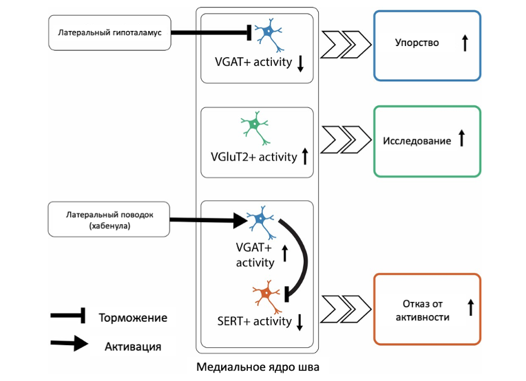 Каждый день мы сталкиваемся с выбором: продолжать ли делать то, что уже приносит результат, или попробовать что-то новое? Иногда мы решаем отступить и сохранить энергию. Эти стратегии – настаивание на привычном, исследование нового или отказ от активных действий – кажутся простыми, но за ними стоят сложные нейронные механизмы. Ученые из Университетского колледжа в Лондоне обнаружили, что ключевым «переключателем» между этими состояниями выступает группа нейронов в среднем мозге, известная как медиальное ядро шва (MRN). Их исследование, опубликованное в журнале Nature, раскрывает, как MRN управляет нашими решениями и как это может быть связано с психическими расстройствами типа депрессии и обсессивно-компульсивного расстройства. Общая схема работы «переключателя» в медиальном ядре шва. Credit: Ahmadlou, M., et al. / Nature 2025 Животные, включая человека, постоянно балансируют между тремя основными стратегиями поведения: привычные действия, исследование новых возможностей и отказ от акт