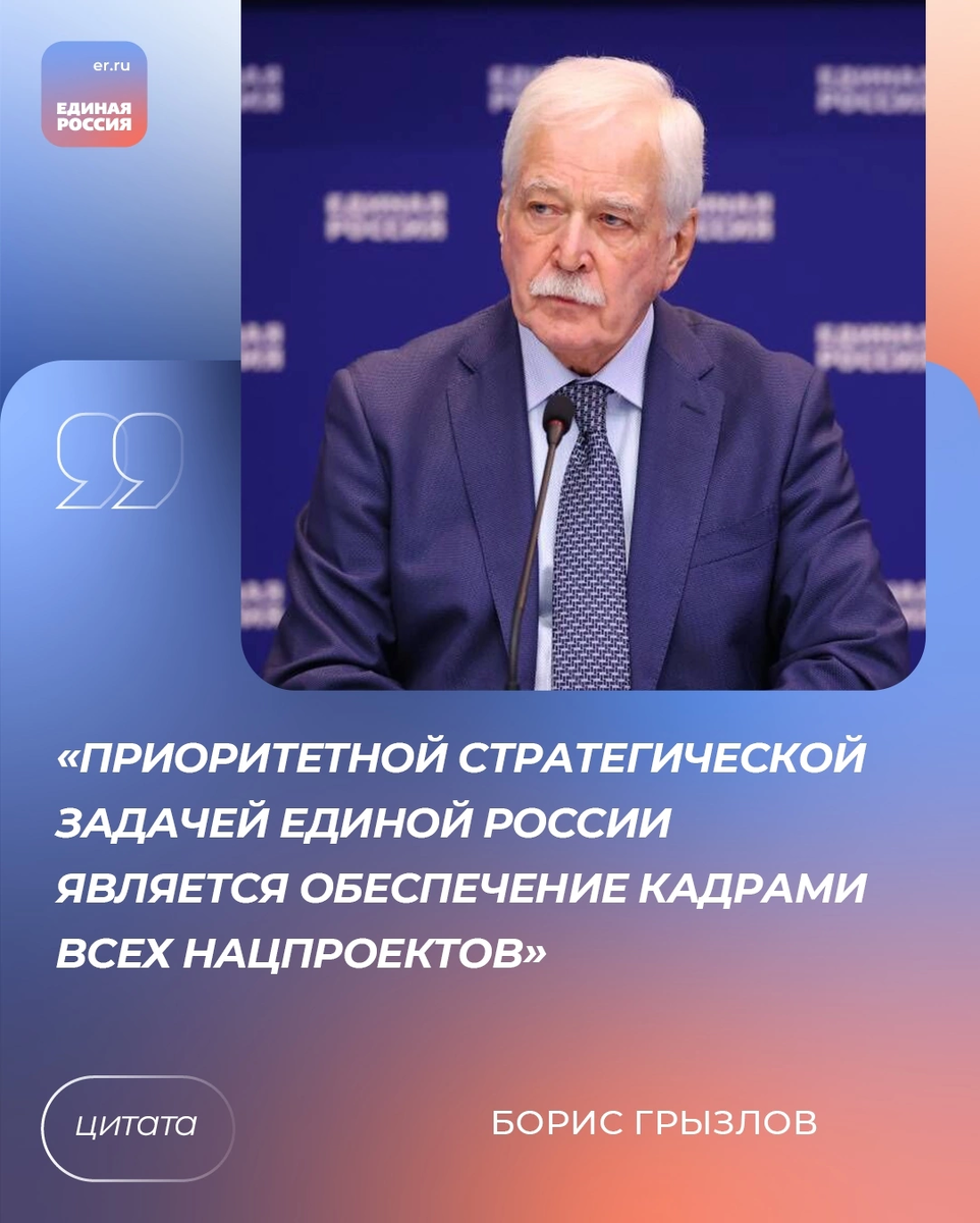 ✅ Приоритетная стратегическая задача Единой России — это обеспечение кадрами всех нацпроектов. Об этом заявил Председатель Высшего совета партии Борис Грызлов. 💬 «Технологическое лидерство неразрывно связано с созданием новых прорывных решений, ломающих сложившиеся цепочки создания добавленной стоимости. В системе образования явная проблема уверенности инженеров в востребованности своих компетенций, молодежь чувствует, что ее обучают технологиям вчерашнего дня, и не дают знаний и навыков для того, чтобы разрабатывать решения для будущего и рассчитывать на успех и признание. Безусловно, есть передовые учебные заведения, которые готовят специалистов в соответствии с новыми идеями, технологиями. Хотелось бы, чтобы таких вузов было как можно больше», – отметил Борис Грызлов.
