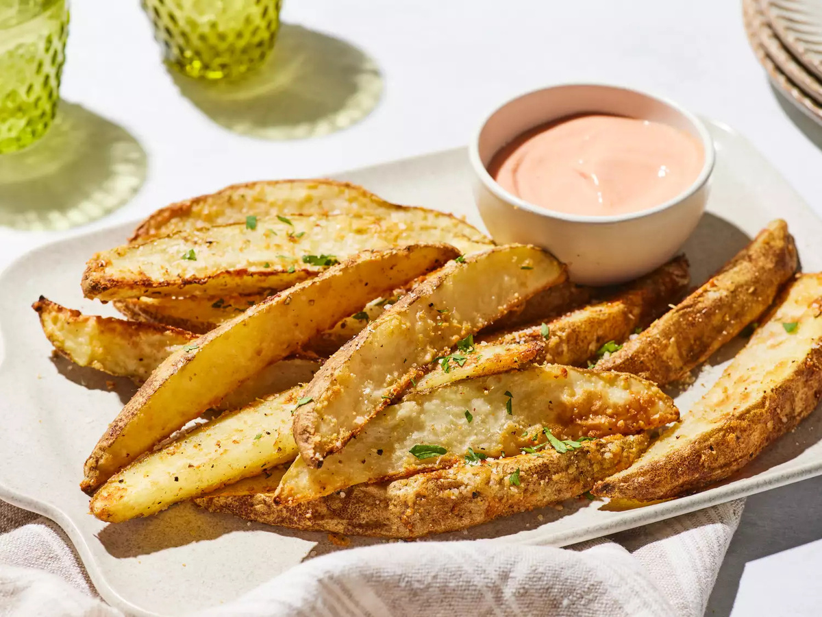 Острым ножом разрежьте картофель вдоль пополам. Переверните его разрезанной стороной вниз и еще раз разрежьте вдоль пополам, получатся четвертинки. Разрежьте каждую четвертинку пополам, чтобы получились картофельные дольки. ✔ Подготовьте ингредиенты. Разогрейте духовку до 220 градусов. ✔ Положите картофель, сыр, оливковое масло, луковый порошок, чесночный порошок, соль и перец в пластиковый пакет. Закройте и встряхните, чтобы картофель равномерно покрылся приправой. Можно не использовать пакет, а перемешать ингредиенты в большой миске. ✔ Выложите картофель на противень, застеленный пергаментной бумагой. ✔ Запекайте примерно 25 минут. Картофель должен легко протыкаться вилкой. Можно запекать на 5-10 минут дольше, чтобы получилась хрустящая корочка. Приятного аппетита!
