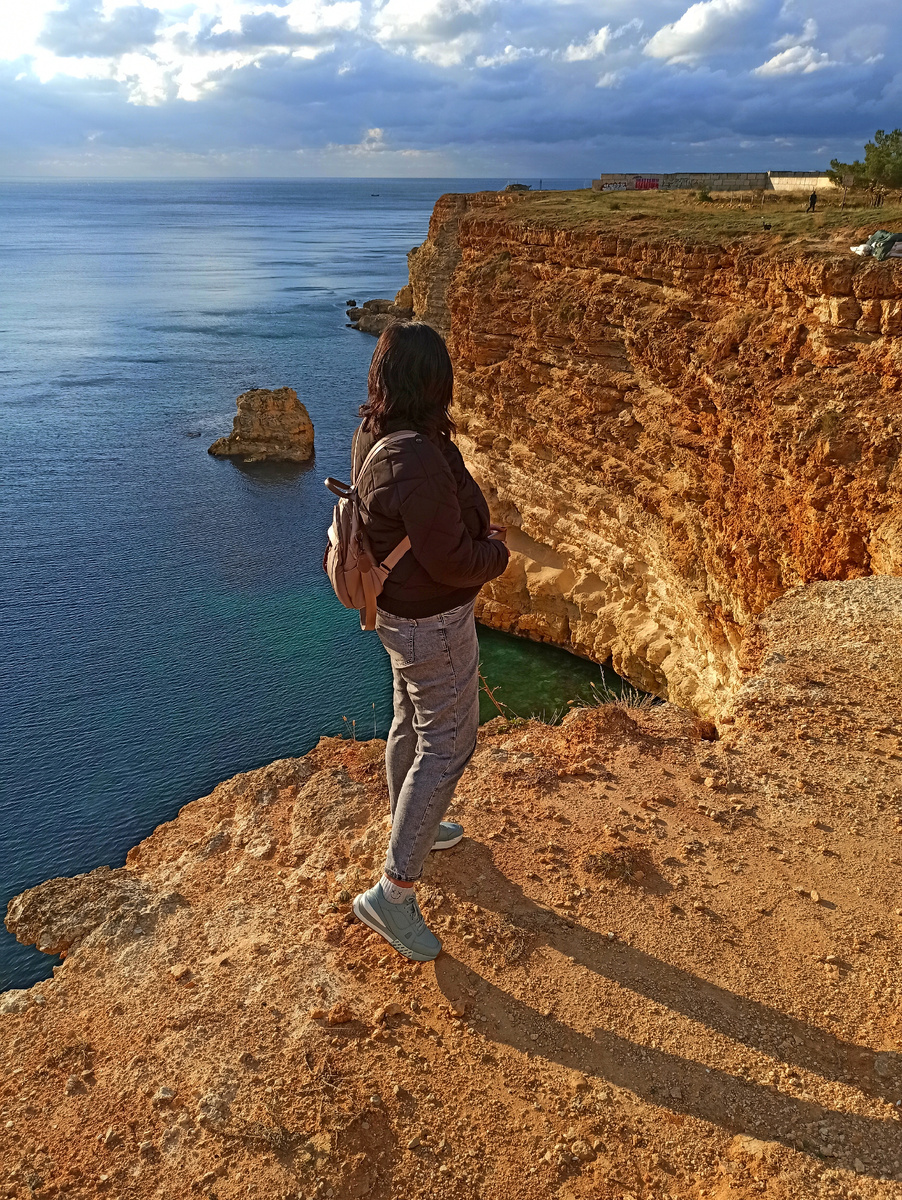 Красивейшие желто - оранжевые скалы, слоистые, как торт Наполеон, предзакатное небо, затянутое облаками и бескрайнее море, плещущееся внизу, под скалами! Так красиво и такое умиротворение, что хочется устроится прямо там, наверху и любоваться закатом! Но где-то там есть пляж Автобат, только непонятно где! Сверху его сразу и не заметишь даже! Середина октября, народу на пляжах уже почти нет! Мы немного прошлись по тропинке на краю обрыва и увидели металлическую лестницу, зигзагами спускающуюся вниз! Вот и спуск на тайный пляж!
