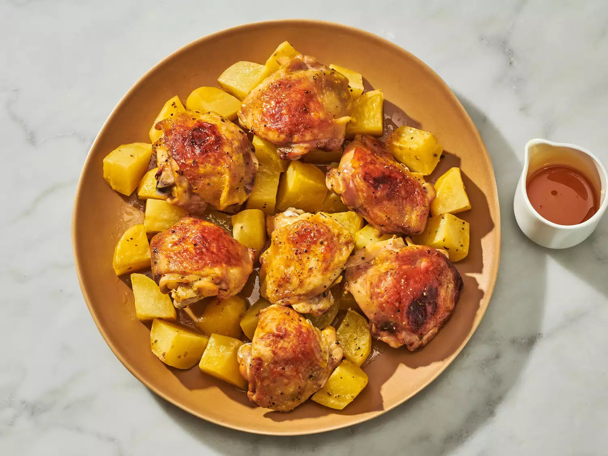 Блюдо готовится в одной форме. Благодаря медово-горчичному соусу картофель тает во рту, а курица получает восхитительный вкус и аромат. ✔ Соберите ингредиенты и разогрейте духовку до 180 градусов. ✔ В большой миске смешайте апельсиновый сок, оливковое масло, горчицу, мед, соль, орегано и перец. Отставьте. ✔ Нарежьте картофель на средние кусочки. Положите его в миску со смесью апельсинового сока. Хорошо перемешайте, а потом выложите в форму для запекания одним слоем. ✔ Положите курицу в миску и залейте оставшейся смесью сока. ✔ Выложите куриные бедра в форму для запекания сверху картофеля. Залейте оставшейся смесью сока. ✔ Запекайте в разогретой духовке 1-1,5 часа. Если курица будет "подсыхать", можете добавить горячую воду во время запекания. Приятного аппетита!