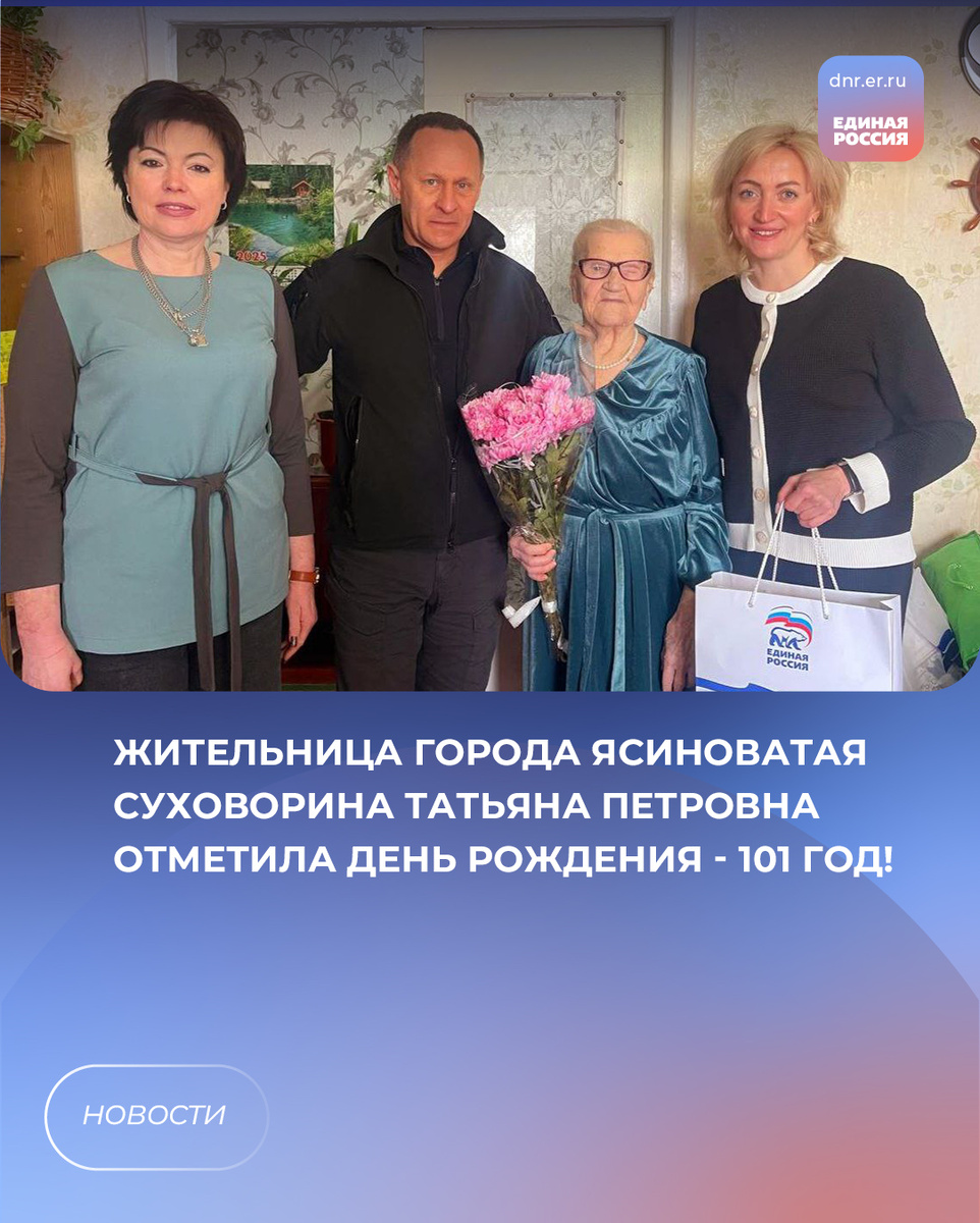 Жительница Ясиноватой Татьяна Петровна Суховорина родилась в 1924 году. Во время Великой Отечественной войны, как и многие комсомольцы, она состояла в женском партизанском отряде имени Н. Крупской. Боролась с врагом в составе бригады «Смерть немецким оккупантам». За проявленный героизм её наградили орденом Отечественной Войны II степени и орденом «За мужество» III степени. Героическому ветерану исполнился 101 год, и чтобы поздравить Татьяну Петровну с этим праздником, её навестили участницы Женского движения Единой России и депутаты Ясиноватского местного совета. Они вручили женщине подарки, поблагодарили за героический путь, который она прошла, и пожелали крепкого здоровья. «Свой праздник Татьяна Петровна встречает в прекрасном настроении, в кругу самых родных и дорогих людей. По словам именинницы, самое главное в жизни – быть честным, благородным и никогда не падать духом. А секрет долголетия заключается в закалке организма», – поделилась депутат Ясиноватского местного совета от фрак