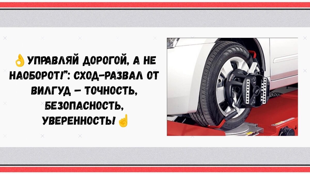 В ВилГуд мы сделаем сход-развал так, что ты снова почувствуешь себя королем дороги! 👑 Что мы предлагаем? 🎯 • Диагностика подвески: Проверим все узлы и детали, чтобы убедиться в их исправности. • Регулировка углов: Максимально точная настройка с использованием современного оборудования. • Компенсация биения дисков: Устраним вибрации и обеспечим плавность хода. • Индивидуальный подход: Учтем особенности твоего автомобиля и стиль вождения. • Проверка результатов: Убедимся, что все параметры соответствуют заводским требованиям. Почему ВилГуд? ✅ • Опытные мастера: Наши специалисты знают толк в геометрии подвески. • Современное оборудование: Используем только точные и надежные стенды. • Гарантия качества: Уверены в результате нашей работы. • Быстро и удобно: Запишись онлайн и сэкономь свое время. • Доступные цены: Сход-развал от ВилГуд – это выгодно! Что ты получишь? ✨ • Улучшенную управляемость. • Снижение износа резины. • Экономию топлива. • Повышенную безопасность. • Комфортную езду