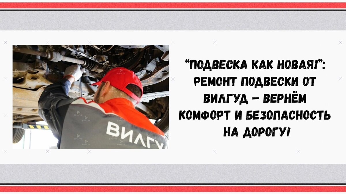 ❤️В ВилГуд мы проведем полный осмотр и качественный ремонт подвески, чтобы ты снова наслаждался комфортной и безопасной ездой! 😌 Что мы делаем? 🛠️ • Диагностика: Комплексный осмотр всех элементов подвески для выявления неисправностей. • Замена амортизаторов: Вернём плавность хода и контроль над автомобилем. • Замена рычагов: Устраним люфты и восстановим геометрию подвески. • Замена шаровых опор: Обеспечим надёжное соединение элементов подвески. • Замена сайлентблоков: Устраним скрипы и вибрации. • Ремонт рулевой рейки: Восстановим чёткость управления. • Замена пружин: Восстановим клиренс и устойчивость автомобиля. Почему стоит выбрать ВилГуд? ✅ • Опытные механики: Знаем все тонкости ремонта подвески. • Современное оборудование: Используем профессиональный инструмент и стенды. • Качественные запчасти: Работаем только с проверенными поставщиками. • Гарантия на работы: Уверены в качестве наших услуг. • Доступные цены: Ремонт подвески в ВилГуд – это выгодно! Результат? 💪 • Улучшенна