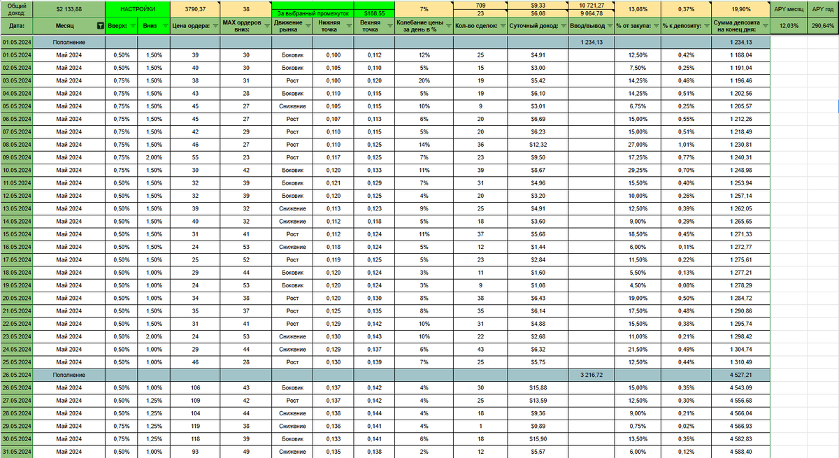 Всем привет! Хочу поделиться опытом, как мне удалось получить почти 1 700 $ (что эквивалентно примерно 150 000 рублей) всего за четыре месяца, практически ничего не делая — просто наблюдая за работой своего торгового бота. Ниже — поэтапно, с цифрами и датами. 1) Старт (1 мая): 2) До 25 мая: 3) 26 мая: 4) Итог: 1) С 1 по 6 июня: 2) 7 июня: 3) С 7 по 30 июня: 4) Выводы в течение июня: 5) Итог: 1) 1 июля: 2) Весь июль: 3) Итог: 1) С 1 по 14 августа: 2) 15 августа: 3) С 15 по 31 августа: 4) Итог: За четыре месяца (май — август) только торговля ботом принесла мне 1 676,03 $. Если пересчитать по текущему курсу, это ориентировочно 150 000 рублей. Всё это время я лишь наблюдал, как бот открывает и закрывает сделки, а каждый вечер в Telegram приходила статистика: сколько сделок сделано и сколько долларов заработано. Если вы заметили, я люблю вести учёт: записываю каждое пополнение, вывод, итоговую сумму и прибыль. Для меня важно видеть живые цифры — это помогает анализировать стратегию и в
