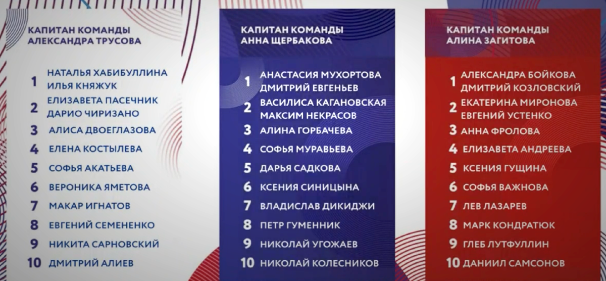 Участников отбирали по спортивному принципу, но некоторые места были по выбору болельщиков или ФФКР. Затем капитаны на жеребьёвке набирали себе команды. В целом, составы получились более-менее сбалансированными. Единственный момент - Саша Трусова-Игнатова первая выбирала мужчин и сразу взяла своего мужа Макара, а так, конечно, она бы предпочла кого-то посильнее.
