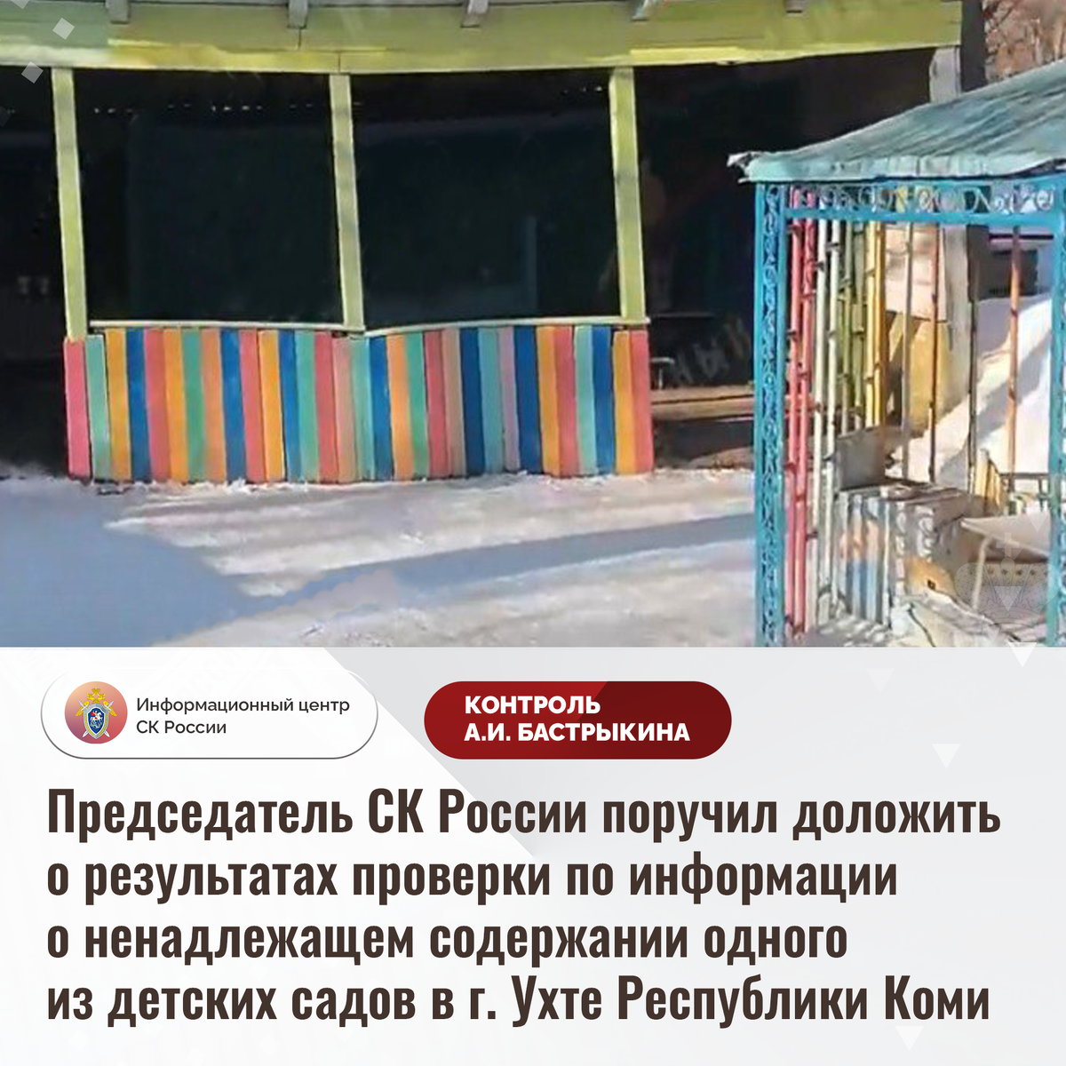 Председатель СК России поручил доложить о результатах проверки по информации о ненадлежащем содержании одного из детских садов в г. Ухте Республики Коми В социальной сети сообщается о ненадлежащем содержании территории детского сада в городе Ухте Республики Коми. Длительное время на верандах учреждения протекает кровля и осыпается шифер, в прогнивших от сырости деревянных полах образовались дыры, на конструкциях появилась плесень. Указанное приводит к травмированию воспитанников. Многочисленные обращения родителей в администрацию результатов не принесли, меры к организации капитального ремонта построек не приняты. В СУ СК России по Республике Коми по данному факту организована процессуальная проверка. Председатель Следственного комитета Российской Федерации Александр Иванович Бастрыкин поручил руководителю СУ СК России по Республике Коми Андрею Николаевичу Исаеву доложить о предварительных и окончательных результатах процессуальной проверки, поставив ее на контроль в центральном аппар