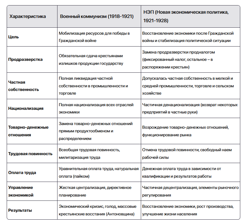 Ключевые отличия: В итоге: Военный коммунизм был политикой, продиктованной чрезвычайными обстоятельствами Гражданской войны и направленной на выживание государства. НЭП – это отход от жесткой централизации и переход к более гибкой экономической политике, позволившей восстановить экономику после разрухи.