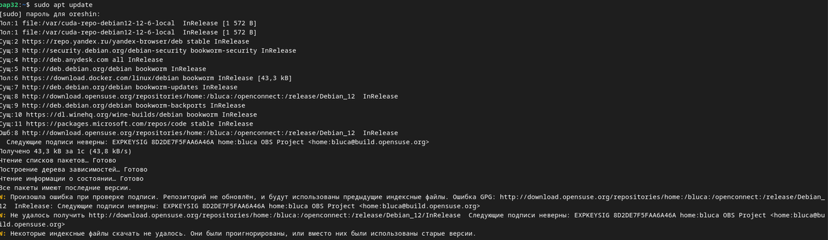 W: Произошла ошибка при проверке подписи. Репозиторий не обновлён, и будут использованы предыдущие индексные файлы. Ошибка GPG: http://download.opensuse.org/repositories/home:/bluca:/openconnect:/release/Debian_12 InRelease: Следующие подписи неверны: EXPKEYSIG 8D2DE7F5FAA6A46A home:bluca OBS Project <home:bluca@build.opensuse.org>