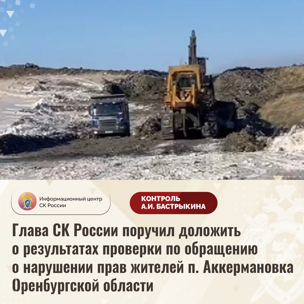 Глава СК России поручил доложить о результатах проверки по обращению о нарушении прав жителей п. Аккермановка Оренбургской области В Информационный центр СК России поступило обращение по вопросу несогласия жителей поселка Аккермановка Оренбургской области с разработкой карьера на озере Забой. В ближайшее время коммерческие компании планируют приступить к добыче горных пород в непосредственной близости от жилых домовладений, что повлечет ухудшение экологической обстановки. Граждане опасаются загрязнения питьевых скважин, что может негативно отразиться на их здоровье. Кроме того, для жителей будет ограничен доступ к единственному месту отдыха возле водоема. Ранее ситуация освещалась в социальной сети. В СУ СК России по Оренбургской области по данному факту проводится процессуальная проверка. Председатель Следственного комитета Российской Федерации Александр Иванович Бастрыкин поручил руководителю СУ СК России по Оренбургской области Вячеславу Давидовичу Зудерману доложить о предваритель