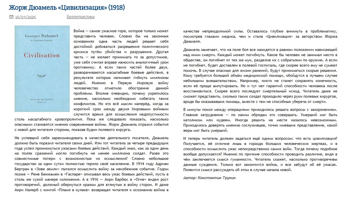 Жорж Дюамель "Цивилизация" (1918) | Критика