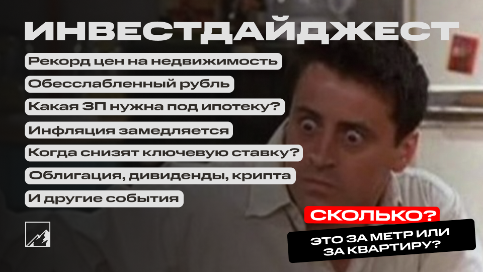 Всем желающим купить первичную недвижку лучше присесть. Она подорожала до максимумов, спасибо льготной ипотеке. Но есть и хорошие новости для фанатов крепкого рубля и дивидендов. Пока крипта валится вниз, замедляется рост инфляции, а эксперты гадают по поводу снижения ключевой ставки. В вашем любимом дайджесте ещё много про что, читайте!