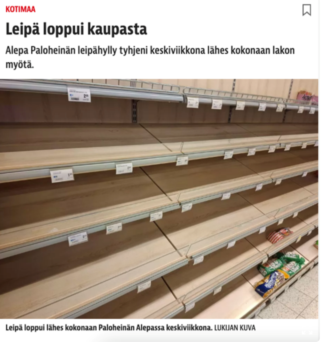 Хлебные полки некоторых финских магазинов опустели. Об этом сообщают ряд местных информационных изданий. В частности Iltalehti, подкрепляя сообщение картинками. Ряд питерских изданий с душком сообщили об этой новости. Реакция аудитории ждать себя не заставила и по обыкновению удивляет. Сперва о том, что же на самом деле случилось. Финские "хлеборобы" и пекари заявили о намерении устроить забастовку в начале марта ещё в феврале. Сюрпризом это не стало. Для нас детали их проблем особого значения не имеют. Хотя стоит обратить внимание на проблемы в отрасли в целом. Не только туризм в прямом смысле, но и те смежные области, которые связаны с ним, конечно, ощутили потерю тех 5,4 миллиона российских туристов, которые пересекали российско-финскую границу до пандемии. Для сравнения, всё население Хельсинки чуть больше 600 тыс.