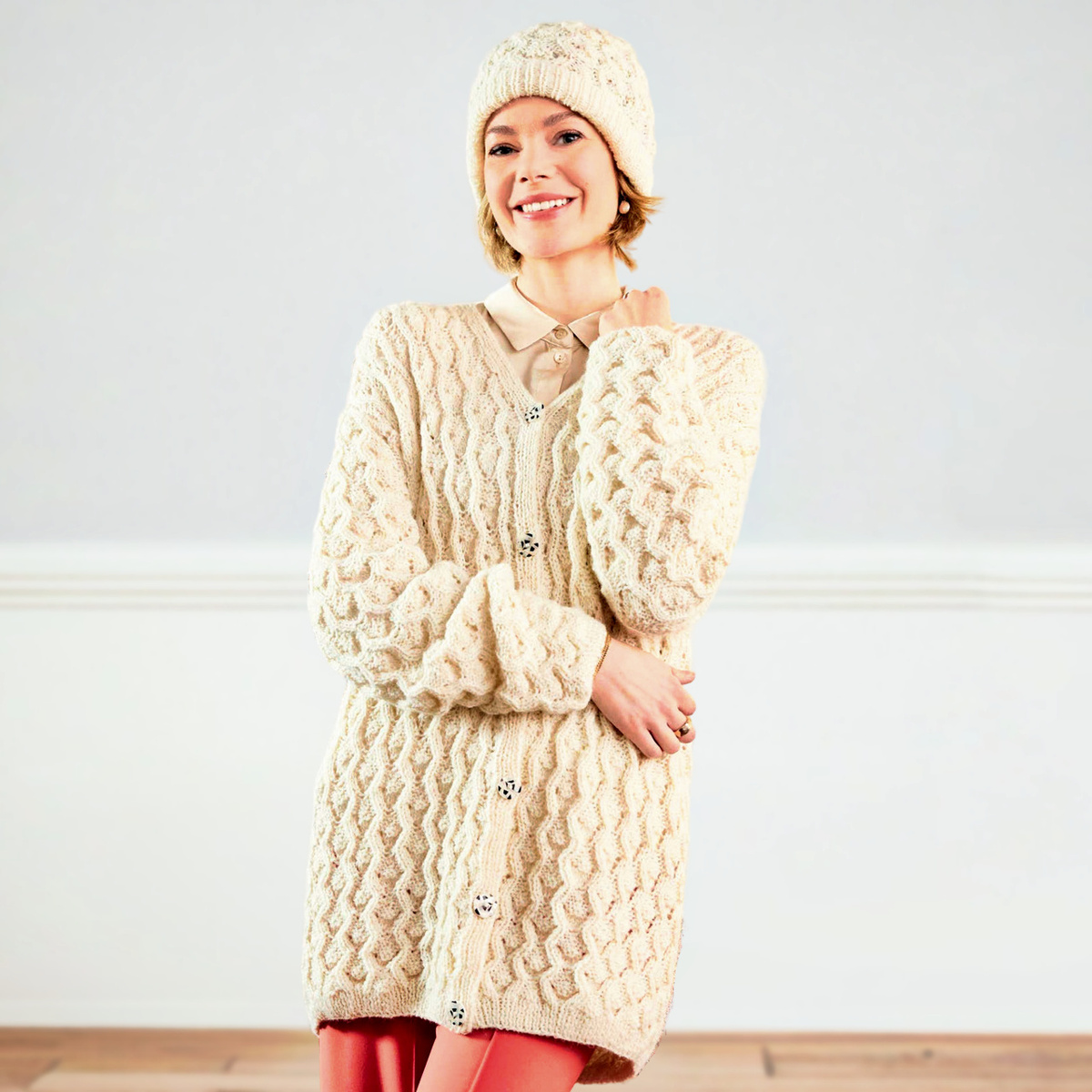 Для вязания нам потребуется 650 (700) 750 г молочной пряжи: 63% шерсть альпака, 37% полиамид; 150 м/ 50 г. Спицы № 4 и 5. А также 6 пуговиц диаметром 22 мм и 2 вспомогательные спицы-булавки.