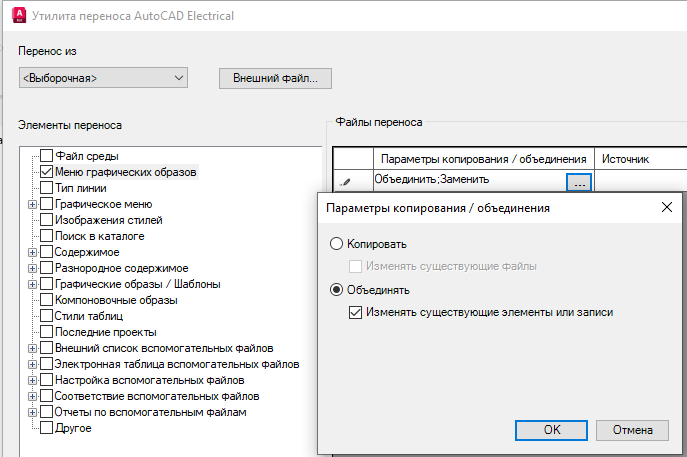 Для переноса графического меню EKF в AutoCAD Electrical сделайте следующее: Запустите Утилита переноса. В окне «Утилита переноса AutoCAD Electrical» выберите элемент переноса - Меню графических образов. Определите параметры переноса. · При выборе Копировать создается отдельный файл графического меню EKF. · При выборе Объединять графическое меню EKF добавляется в выбранное меню – приёмник. Кликните по полю Источник. Откройте папку «Графическое меню УГО» в ранее сохраненной базе данных оборудования EKF для AutoCAD Electrical. Выберите файл ACE_IEC-EKF_MENU_v2.DAT и нажмите Открыть. Кликните по полю Приемник. В папке Support выберите файл АСЕ_IEC_MENU.DAT (графическое меню для схем по Европейским стандартам) и нажмите Открыть. В окне «Утилита переноса AutoCAD Electrical» нажмите ОК. В окне «Обзор переноса» нажмите ОК. В окне «Перенос выполнен» нажмите Готово. Для использования перенесенных файлов перезапустите AutoCAD Electrical. Файл графического меню для схем задается в свойствах проект
