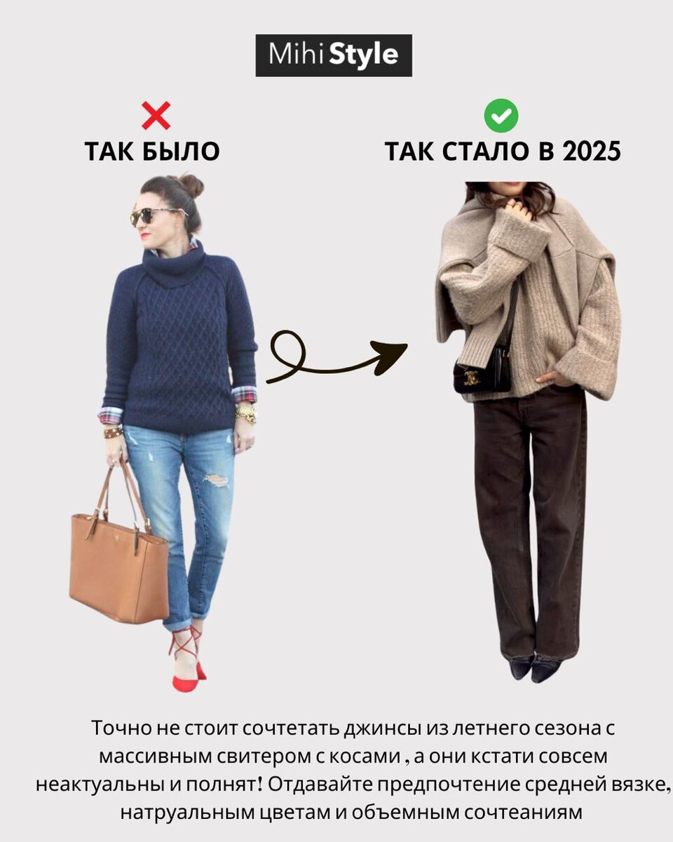 Дорогие мои подписчицы! 💕 Мы продолжаем нашу любимую рубрику «Так было, а так стало», которая помогает нам переосмыслить наш гардероб и сделать его более современным и стильным. Сегодня я подготовила для вас еще несколько примеров того, как небольшие изменения могут полностью преобразить ваш образ. Мне очень нравится эта рубрика, потому что она показывает, что стиль — это не про постоянные покупки, а про умение сочетать вещи и добавлять актуальные детали. Давайте вдохновляться вместе! Так было:Массивный свитер с косами, который полнит и выглядит устаревшим. Так стало:Свитер средней вязки в натуральных цветах, который сочетается с объемными джинсами. Точно не стоит сочетать джинсы из летнего сезона с массивным свитером. Отдавайте предпочтение средней вязке и натуральным цветам — это сделает образ более современным и уютным. Так было: Укороченные и прилегающие вещи, которые уже не в тренде. Так стало:Замшевые вещи в натуральных коричневых оттенках, которые делают образ совр