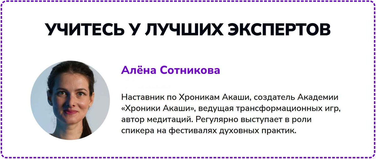 Рекомендуем пройти курс от Алёны Сотниковой - Наставник по Хроникам Акаши, создатель Академии «Хроники Акаши», ведущая трансформационных игр, автор медитаций. Регулярно выступает в роли спикера на фестивалях духовных практик.