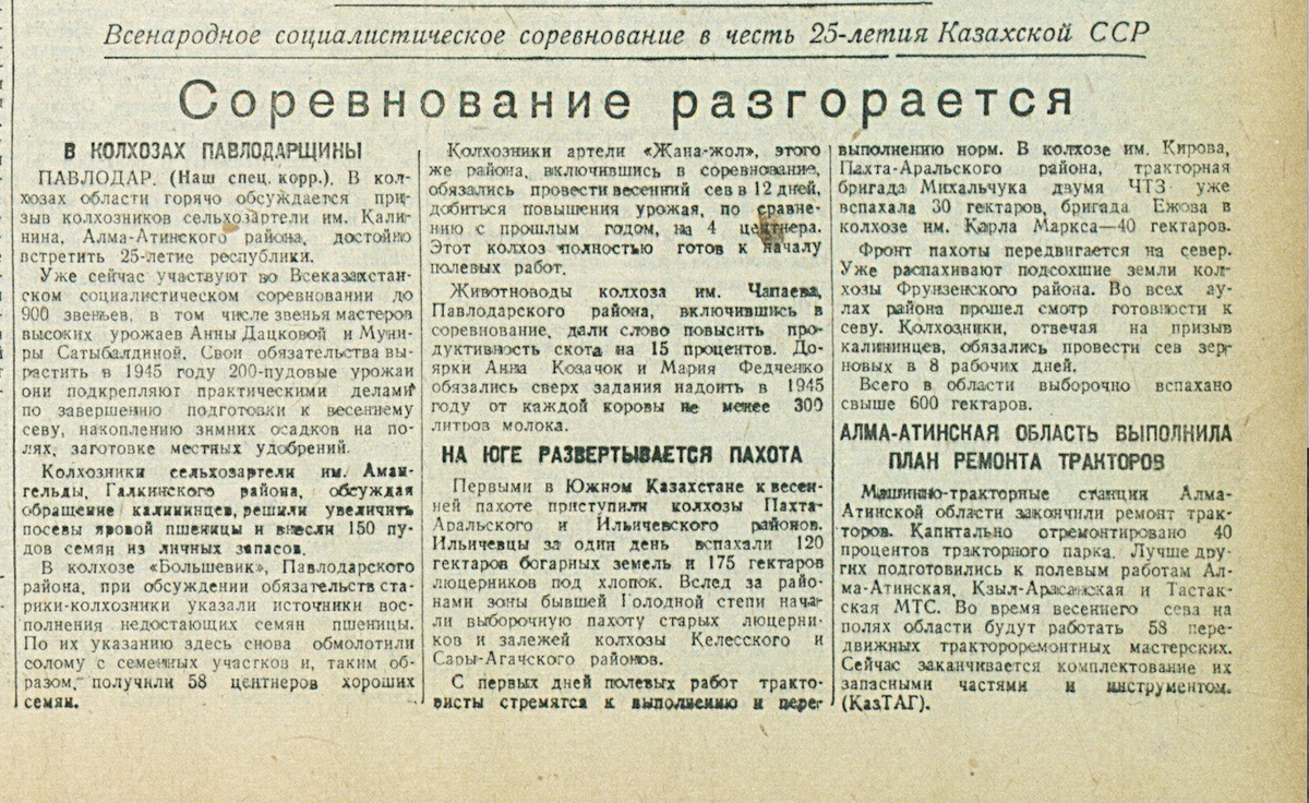 В этот день, 16 марта 1945 года, газета «Казахстанская правда» публикует новости о трудовых достижениях колхозников: участвующих о Всенародном социалистическом соревновании в честь 25-летия Казахской ССР. В КОЛХОЗАХ ПАВЛОДАРЩИНЫ Павлодар. (Наш спец. корр.). В колхозах области горячо обсуждается призыв колхозников сельхозартели им. Калинина, Алма-Атинского района, достойно встретить 25-летие республики. Уже сейчас участвуют во Всеказахстанском социалистическом соревновании до 900 звеньев, в том числе звенья мастеров высоких урожаев Анны Дацковой и Муниры Сатыбалдиной. Свои обязательства вырастить в 1945 году 200-пудовые урожаи они подкрепляют практическими делами по завершению подготовки к весеннему севу, накоплению зимних осадков на полях, заготовке местных удобрений. Колхозники сельхозартели им. Амангельды, Галкинского района, обсуждая обращение калининцев, решили увеличить посевы яровой пшеницы и внесли 150 пудов семян из личных запасов. В колхозе «Большевик», Павлодарского района, п