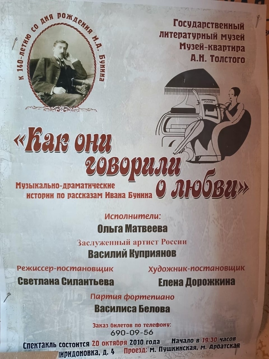 Однако настоящее знакомство и подлинное погружение в мир его стихов и прозы произошло значительно позже. Только в середине 90-х годов прошлого столетия я приступил к работе над спектаклем по рассказам И.А. Бунина из знаменитого сборника «Темные аллеи» (режиссер Наталья Тимофеева). Поначалу он состоял из двух рассказов, «Галя Ганская» и «В Париже». Это был мой первый опыт, когда в один вечер предстояло сыграть два различных по возрасту и характеру персонажа. Выступать предполагалось на музейных площадках, где сама обстановка располагала к воплощению необходимой временной атмосферы.