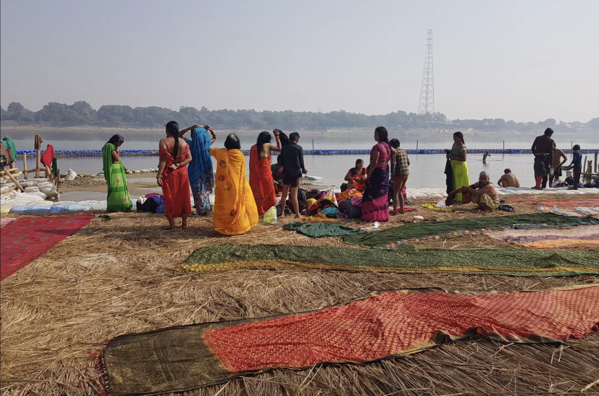 Индийские женщины купались прямо в сари, затем выходили из воды, переодевались и расстилали на берегу длинные куски материи, от чего берег окрашивался в разные цвета.