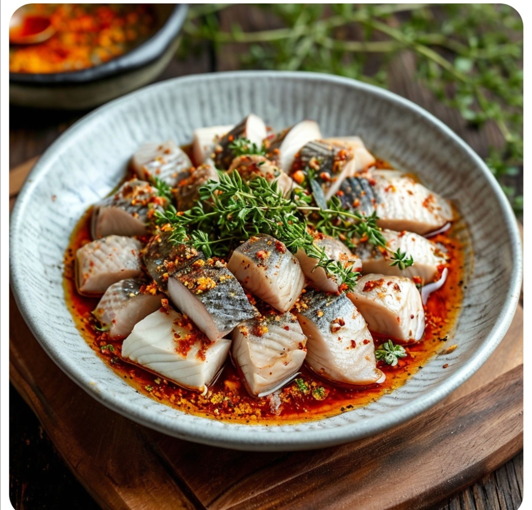 Для приготовления необходимо подготовить компоненты: -2 крупных селёдки, примерно 900 грамм. - 7 крупных зубчиков чеснока -сладкая паприка 1 чайная ложка 5 грамм - рисовый или яблочный уксус 1 столовая ложка. -чёрный перец 1/4 чайной ложки -растительное масло 30 мл 1) Очистить от кожи и костей чтобы подготовить филе. Режим кусочки филе на кусочки по 5 см. Выкладываем в тарелку. 2) Зубчики чеснока моем, режем мелко до однородной структуры. Добавляем к сельди. 3) Добавляем приправы сладкую паприку, уксус, чёрный перец, растительное масло все перкмешиваем. 4) Убираем тарелку с сельдю в холодильник на 1 час и подаём к столу. Можно украсить зеленью орегано или майорана. Приятного аппетита!