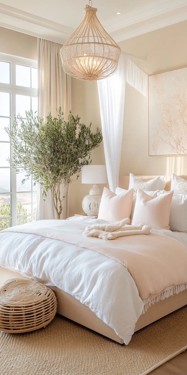 Современная минималистичная спальня: уют и стиль в каждой детали Минимализм — это не просто стиль, а образ жизни. Он сочетает в себе простоту, функциональность и эстетику, создавая пространство, в котором легко дышится и приятно отдыхать. Сегодня мы расскажем, как оформить современную минималистичную спальню в теплых бежево-персиковых тонах, сделав её уютной и гармоничной. Цветовая гамма: теплота и спокойствие Для создания расслабляющей атмосферы спальня оформлена в нейтральных оттенках. Светлые бежевые и кремовые стены служат фоном для мягкого текстиля в персиковых и пастельных тонах. Такой выбор цветов способствует комфорту и умиротворению, а также делает пространство визуально более просторным и светлым. Центр комнаты — кровать мечты Главным элементом спальни является просторная кровать с деревянным светлым каркасом. Её украшают постельное бельё из натуральных тканей, легкий персиковый плед и декоративные подушки разных текстур. Мягкий текстиль придаёт интерьеру уюта, сохраняя при э