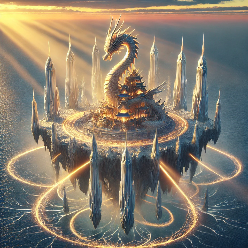 Плавучий Остров встретил героев мерцающим сиянием, исходящим от самой его поверхности. Драконий Храм величественно возвышался в центре, его массивные башни, напоминающие изогнутые шеи драконов, уходили в вечернее небо. Золотистые лучи заходящего солнца пронизывали кристаллические формации, разбросанные по периметру острова, создавая фантастическую игру света и тени.