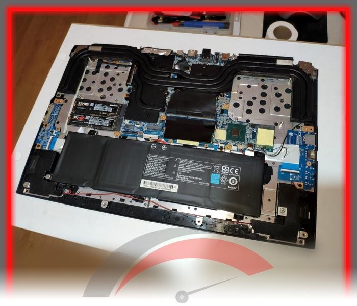 Что же было у MSI Alpha 15 для сравнения? А было вот такое мракобесие, для доступа к радиатору нужно было полностью снять и разобрать систему охлаждения, то есть ноутбук по факту необслуживаемый у MSI, а обслуживать надо, турбины к слову тоже были необслуживаемыми, одна барахлила, но смазать было невозможно, в итоге поломалась и пришлось заказывать новую позже, брр...