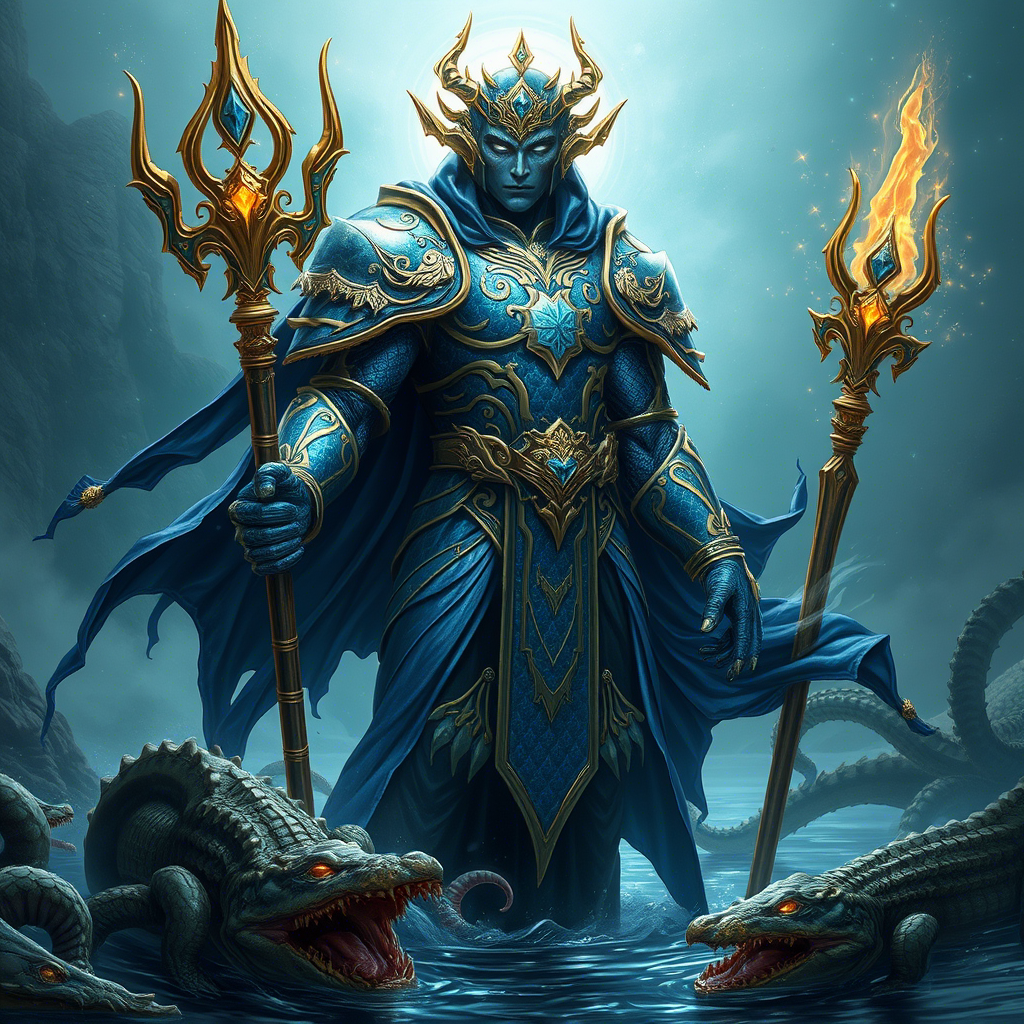 Космос стоял в сердце океана, где вода становилась плотью, а волны — его дыханием. Его синие доспехи, словно морские глубины, переливались золотом (💎) — символом власти, данных ему самой Вечностью. В одной руке трезубец с факелом, пляшущим ярко-оранжевым пламенем (🔥) , в другой — оружие, инкрустированное драгоценностями (💎) . «Я — не бог, но я ношу его бремя», — шептал он, глядя на туманную даль. Его маска, увенчанная шлемом с лучами (✨) , скрывала лицо, но поза — прямая и гордая — говорила о тысячелетиях власти. II. Трезубцы и Факел: Символы Силы Первый трезубец, с золотыми узорами, был «ключом к миру» — он мог успокоить бури, заставить корабли плыть даже сквозь ледяные пустоши. Второй же, с факелом, был «ножом судьбы» — его пламя могло сжечь города или подарить жизнь новым цивилизациям. «Огонь и вода — два сердца моей души», — говорил он, глядя на морских змей, которые плыли вокруг, как тень его величия. Их зубы (🐍) сверкали, но они не смели напасть — они были частью его королев