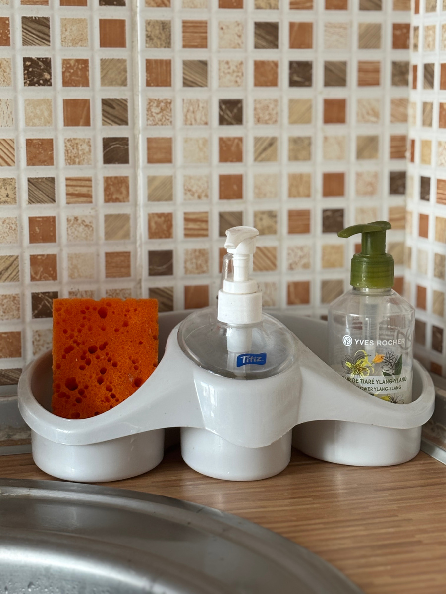 Я перестала покупать мыло и «Фэйри» в индивидуальных бутылках, покупаю сразу большим объемом и переливаю. На кухню купила вот такой органайзер, средство для посуды наливаю в центральную встроенную часть, а мыло наливая в старенькую бутылку от подаренного Ив Роше.