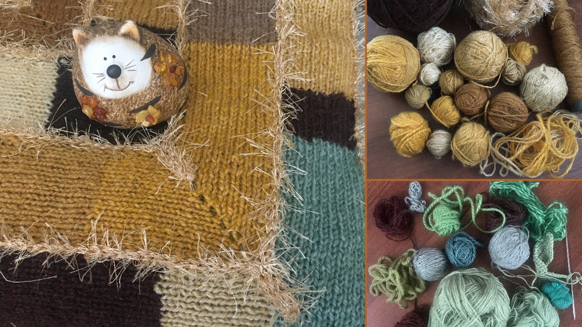 Показываю один из способов превратить залежи маленьких клубочков в трикотажное полотно с рисунком в виде цветных пятен, а не длинных тонких полосок. Самое очевидное применение этой техники вязания на спицах – плед прямоугольной формы. Вяжется от центра как одно полотно, не надо сшивать детали. Небольшой плед «Янтарный» получил своё название благодаря керамическому коту с янтариками. Придавила этой фигуркой полотно ещё в начале вязания, чтобы край не загибался при фотографировании, и так хорошо кот вписался в натюрморт, как родной! Я решила, что «случайности не случайны», и имя определило выбор дополнительного цвета для вещи. К основному коричневому можно было добавить оттенки зелёного или красного, были и такие, и такие клубочки. Очень люблю редкий зелёный янтарь, поэтому выбрала этот цвет. Вязание по спирали отлично подходит, чтобы пустить в дело остатки пряжи. Из секционно окрашенных ниток получается не менее красиво, но об этом в другой статье. То есть начинаем с подбора пряжи по цв