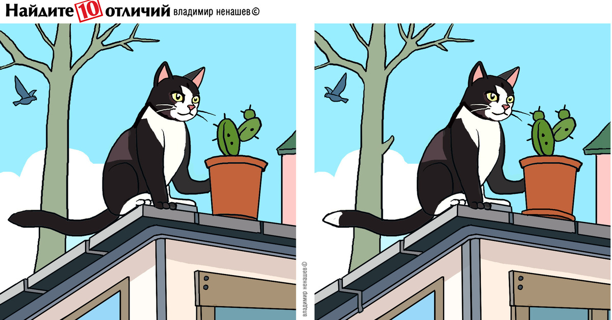 10 отличий для выходного. Кот на крыше и горшок с кактусом. Тест на внимание.
