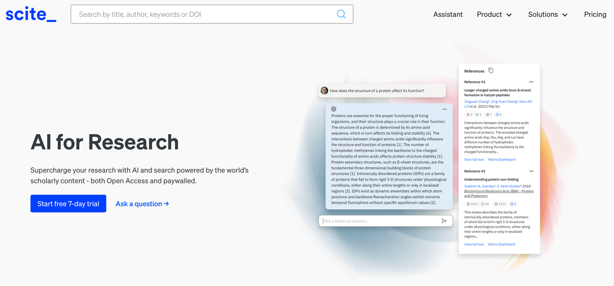 Scite.ai — настоящий прорыв в мире научных нейросетей 2025 года. В отличие от многих аналогов, эта система не генерирует "воду" и необоснованные утверждения, а работает исключительно с проверенными фактами. Нейросеть обучена на огромном корпусе научных статей и предоставляет информацию с прямыми ссылками на исследования.