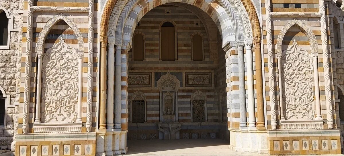 Я была не только в этом месте, но и еще в нескольких интересных местах. Но сейчас хочу показать именно вот это. У меня был где-то пост про него, но тут в Дзене если сразу в подборку не добавил, не найти ничего. У меня тут за 6 лет более 5000 публикаций. Я честно битый час отлистывала, долистала до мая прошлого года. Но больше сил нет уже. Так что если потом найду первый пост, репостну его, следите за публикациями. В целом (там было подробно описано все, тут кратко в двух словах напишу) этот дворец решил себе построить один ливанский врач. говорят, что, вроде бы, сам еще дизайн всей этой красоты разрабатывал. Вот, пока я еще на стуле сижу, я вам покажу эту красоту и спать. Хотя, сначала - есть. У вас 4 утра. Но в 1975 году в Ливане началась гражданская война и, видимо, у него из-за этого денег не стало. Стройка остановилась. Потом не стало ее вдохновителя. Я, в общем, про это рассказывала. Сегодня хочу показать фотографии некоторых элементов декора этого дворца. Парадный вход выгляди