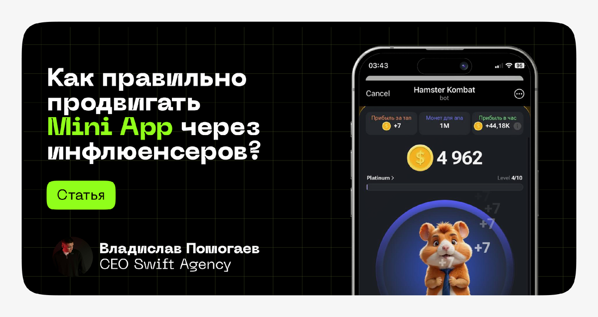 Привет! На связи Влад, основатель swiftagency.ru. Если вы хотите, чтобы ваш Telegram Mini App разлетелся по аудитории, то без инфлюенсеров не обойтись. Но если просто купить рекламу у первых попавшихся блогеров, можно легко потерять деньги без результата.