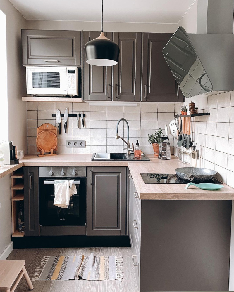 Кухня всего 4,5 кв. м, поэтому обеденный стол находится в гостиной. Кухонный гарнитур заказали в строительном магазине, цвет фасадов — серый, владелице он ни разу не наскучил. Места хоть и мало, но зона получилась функциональной. Есть и микроволновка, и духовой шкаф, посудомойка (оба по 45 см шириной), плита и даже измельчитель бытовых отходов.