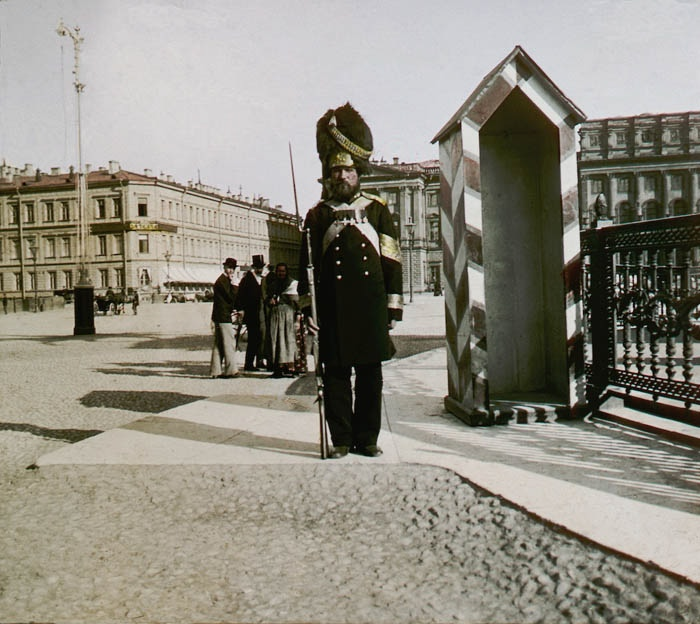 На снимке часовой из личного состава Роты дворцовых гренадер на посту у памятника Николаю I на Исаакиевской площади в Санкт-Петербурге . 1896 год.