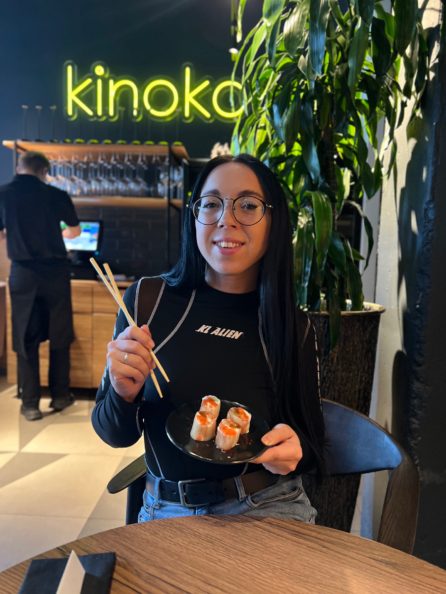 🍱Настоящий азиатский обед, обещает нам новый японский премиальный ресторан KINOKO - который недавно открылся в бизнес сити. 👌Я пришла проверить, ведь азиатскую кухню я обожаю. Мы заказали: - Салат с зеленью, грибами и свининой. Вкусный и лёгкий салат. Понравилась тонко порезанная свинина и соус. Такой рекомендую брать. - Суп Фобо. пробую впервые. Бульон хороший но сам суп не по мне. Лучше бы взяла Том Ям с курицей. - Ролл с морской капустой и угрём. Вкусный небольшой ролл. Понравилось то, что васаби был натёртый ( а не порошковый ), ролл стоит 480 рублей. - Удон с говядиной. Обычный вкусный удон. Мы такой дома стабильно готовим. Порадовало, что не хуже как во многих местах. - Ролл с сыром и фруктами. Это просто 4 маленьких кусочка сыра и фруктов в рисовой бумаге. Это вкусно - но маловато на мой взгляд. Цена была около 200 рублей, поэтому ругать не могу. 👍Я осталась довольна качеством блюд, обстановкой, в сервисе ничего необычного, но за двоих я заплатила 1800 рублей - и мы п