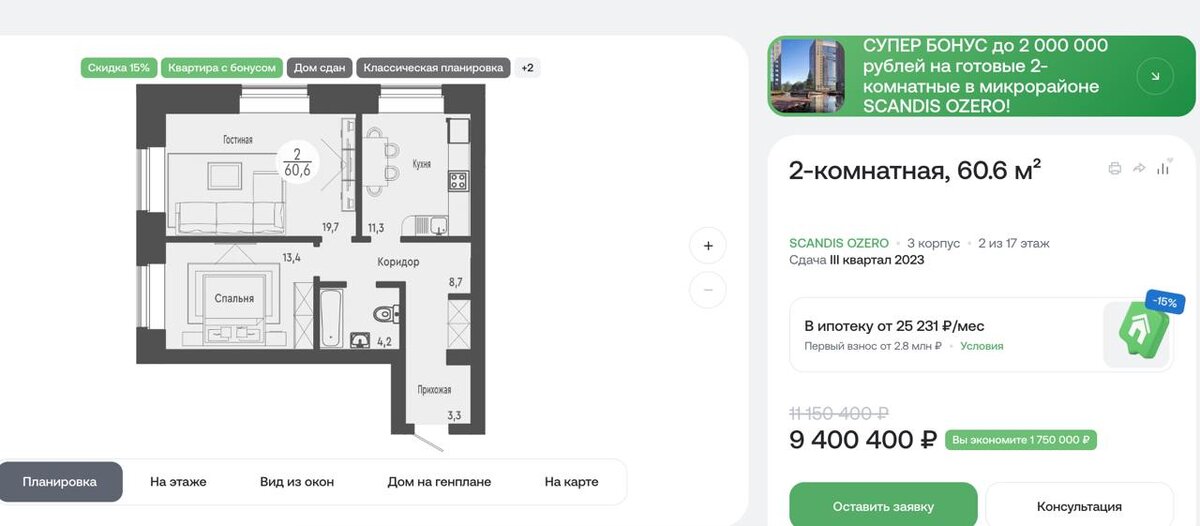 2-комнатная квартира в одном из самых интересных жилых комплексов - "Scandis Ozero" (дом сдан больше года тому назад) недавно предлагалась с бонусом 2 000 000 рублей.