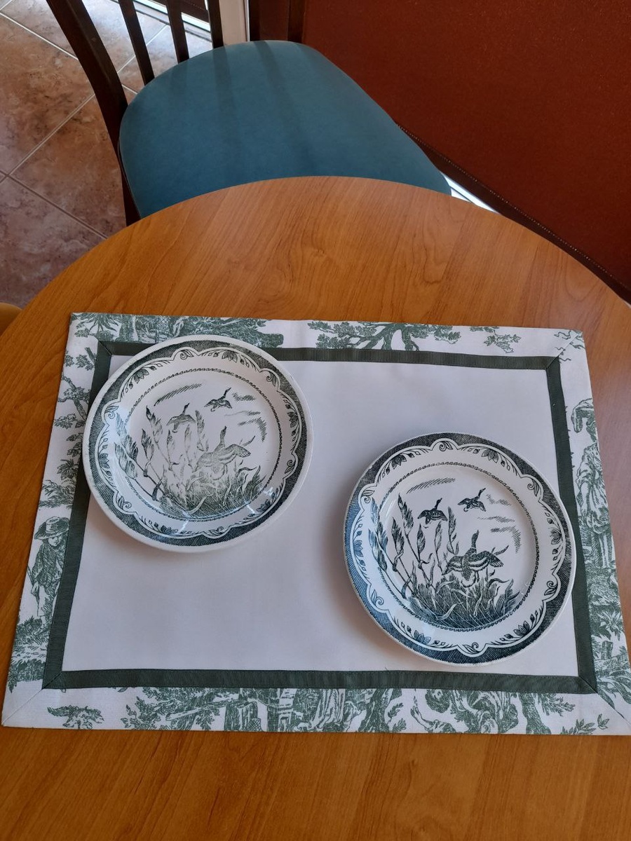 Доброго всем дня! Сегодня предлагаю полюбоватся на десертные тарелочки Будянского фарфорового завода. Сюжет охота. Обе тарелочки лежат на персоннике, сшитом моей коллегой Екатериной. Это ее дебют на моем канале. Я купила на Озоне ткань "Туаль де Жуи" и она создала эту красоту: четыре персонника и дорожку. У меня на них далеко идущие планы. Скоро покажу их в сервировке. И вот еще две симпатичные тарелочки Конаково ЗиК. Яблочки. Яблочки в центре ручная роспись. Эти тарелочки встречаются, но редко. Спасибо за внимание