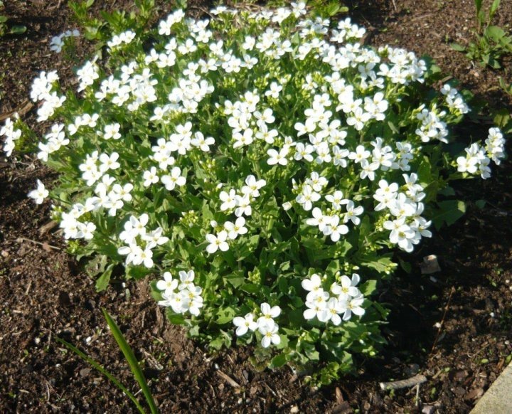 Арабис (резуха) — многолетнее почвопокровное растение семейства Капустные. Цветет в конце апреля — мае мелкими белыми, розовыми или сиреневыми цветками. Предпочитает солнечные места и хорошо дренированную почву. Используется в альпинариях, бордюрах и для украшения каменистых садов. Быстро разрастается, требует контроля. Неприхотлив и морозостоек.