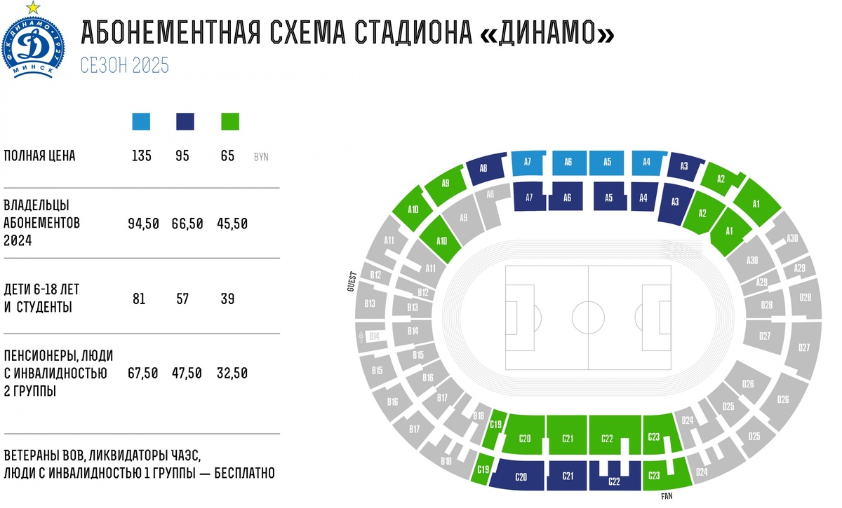Минимальный: «Торпедо-БелАЗ» — 50р (1389₽, 14€), «Динамо» Минск и БАТЭ — по 65р (1806₽, 19€). Премиальный: БАТЭ — 100р (2779₽, 29€), «Динамо» Минск — 135р (3751₽, 39€). Для взрослого + ребенка: БАТЭ — 30 + 65 = 95р (2640₽, 27€), «Динамо» Минск — 65 + 39 = 104р (2881₽, 30€).